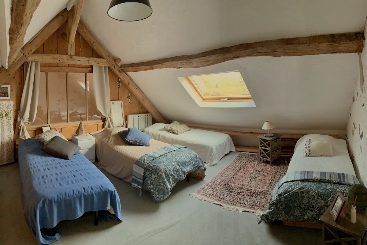 Des chambres partagées (2 à 5 personnes) lumineuses et spacieuses. Volumes généreux, poutres anciennes, décoration soignée. Une simplicité élégante, fidèle aux valeurs du lieu : partage et authenticité.